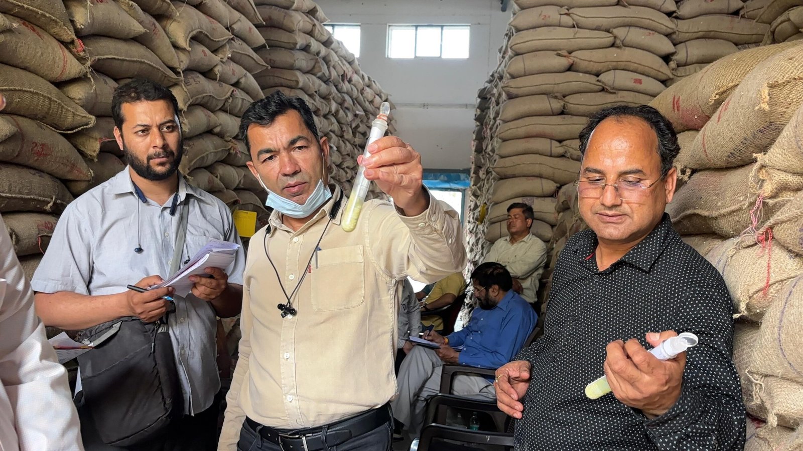 डीएम के निर्देश पर गुलर घाटी खाद्य गोदाम में सभी लाट में रखे चावलों के नमूने लेकर जांच।