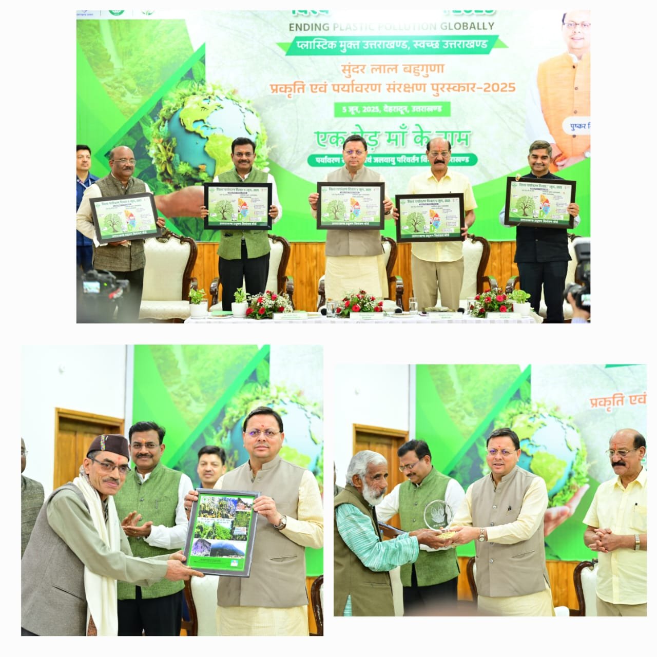 मुख्यमंत्री श्री पुष्कर सिंह धामी ने गुरुवार को मुख्यमंत्री आवास स्थित मुख्य सेवक सदन में विश्व पर्यावरण दिवस के अवसर पर पर्यावरण के क्षेत्र में सर्वश्रेष्ठ कार्य करने वाले लोगों को सम्मानित किया। सुन्दर लाल बहुगुणा प्रकृति एवं पर्यावरण संरक्षण पुरस्कार-2025 (सरकारी श्रेणी) में नगर निगम रूद्रपुर को सम्मानित किया गया। नगर निगम रूद्रपुर से उप नगर आयुक्त श्रीमती शिप्रा जोशी ने यह पुस्कार प्राप्त किया। सुन्दर लाल बहुगुणा प्रकृति एवं पर्यावरण संरक्षण पुरस्कार-2025 ( गैर सरकारी श्रेणी) में श्री विजय जड़धारी एवं श्री प्रताप सिंह पोखरियाल को सम्मानित किया गया। उत्तराखंड प्रदूषण नियंत्रण बोर्ड के जागरूकता पोस्टर का विमोचन एवं इको टूरिज्म कॉर्पोरेशन द्वारा तैयार किए गए पोर्टल का भी मुख्यमंत्री ने लोकार्पण किया। इस अवसर पर मुख्यमंत्री ने प्लास्टिक मुक्त उत्तराखण्ड की शपथ दिलाई एवं स्कूली बच्चों को कपड़े के बैग प्रदान किये।