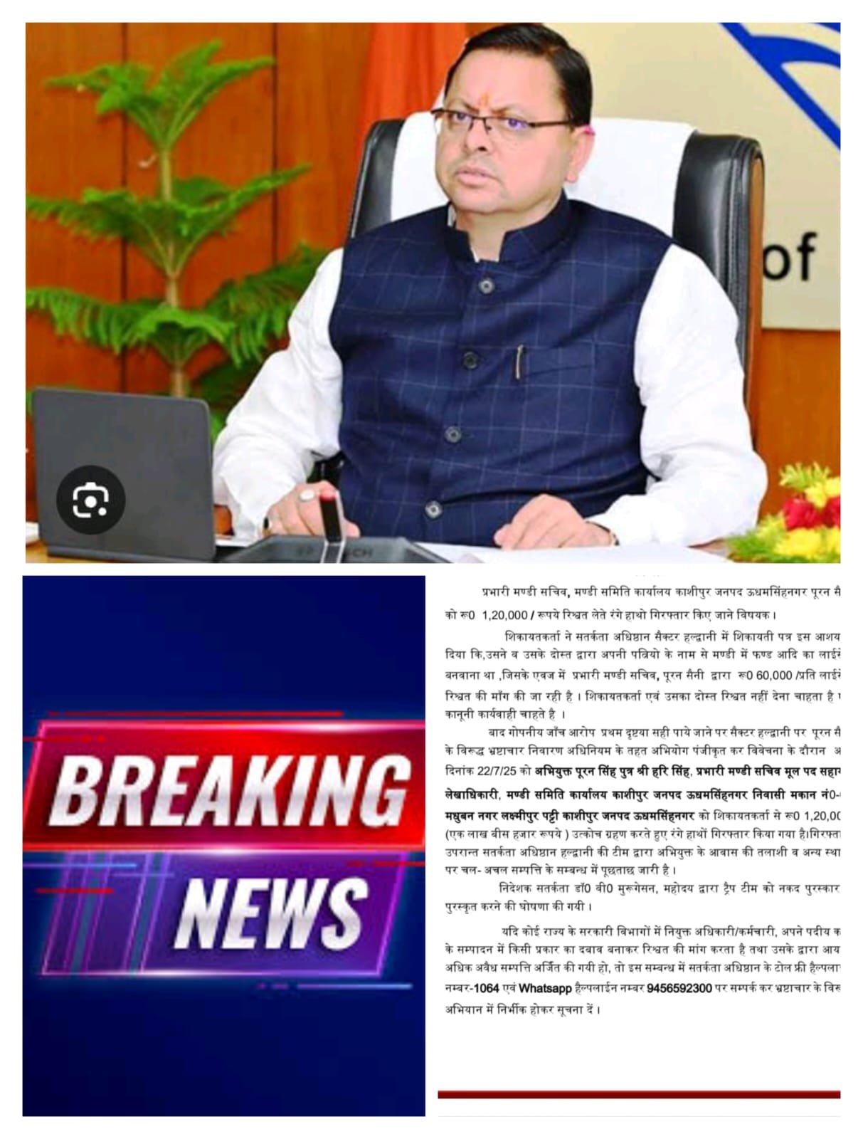 सीएम पुष्कर सिंह धामी की भ्रष्टाचार मुक्त उत्तराखंड मुहिम को बड़ी सफलता, विजिलेंस टीम ने रिश्वतखोर मंडी सचिव को लिया हिरासत में